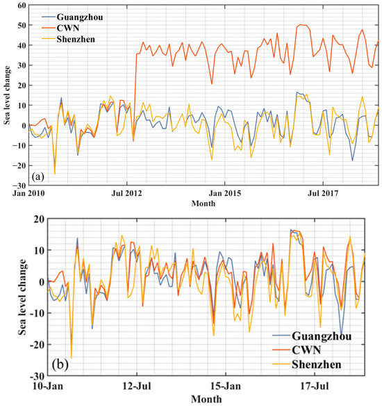 Comparing the base series of the CWN tidal station with the reference series of the Guangzhou tidal station and Shenzhen tidal station before (a) and after (b) adjustments to correct inhomogeneities resulting from tide gauge zero shifts in October 2012 to December 2018.