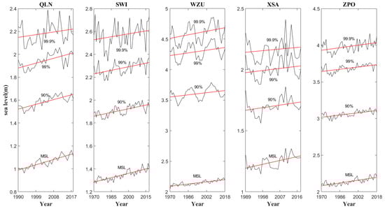 The annual MSL and 99.9%, 99%, and 90% percentile sea levels at the 10 tidal stations (black solid lines). The solid red lines represent the linear trends.