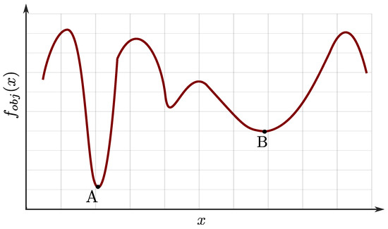 To illustrate this, in Figure 1, it is possible to distinguish among different local optima, i.e., the minima of the objective function . Each one is characterized by a different behavior. Point B is referred to as a robust optimum since it remains locally optimal even when a relatively large variation occurs. Conversely, despite the fact that A is a global optimum, if the same variation perturbs point A, the objective function increases sharply, losing optimality with respect to point B; i.e., it is effectively more sensitive to variations in x. A conventional formulation of the associated RO problem is provided in Section 2.