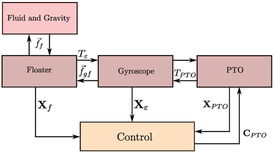 In this section, the ISWEC modeling details are described. In Figure 3, the ISWEC functional diagram is presented. The block chart provides a concise visual representation of the device’s behavior, encompassing forces and reactions between the floater and the gyroscope, as well as the control actions and signal flow of the PTO system [54]. In the image, we can recognize the following elements: