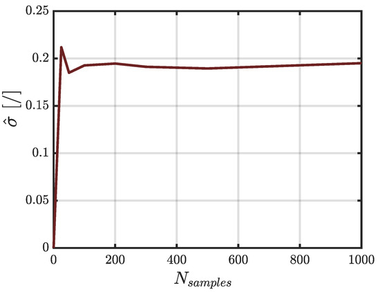 While the literature includes studies on optimizing sampling in terms of quantity, distribution, and parameter space geometry [49], the focus for this study was solely calibrating the number of samples. To determine the minimum number of samples necessary to achieve a good system PDF representation, the focus was the convergence of standard deviation, as illustrated in Figure 4; that is, a good convergence ratio was reached with 1000 samples. The notation symbol represents the normalization of the nominal expected value of the output under examination, .
