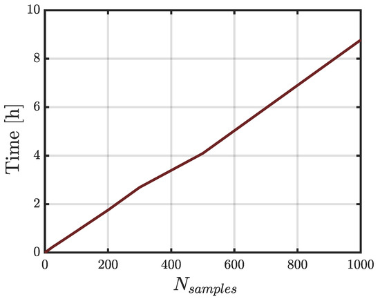 Simultaneously, when observing that the trend of the standard deviation converged with an increasing number of samples, a significant rise in computational costs could also be noticed. This is visually reported in Figure 5: the computational burden follows a likely linear trend, also highlighting the impracticality of investing such a substantial amount of time (8 h) to conduct a complete robustness quantification process for a single device. This drawback becomes even more relevant when considering the necessity of repeating a high number of simulations, e.g., for an RDO framework, for which the evaluation of the objective function might need to be performed thousands of times for the RQ phase. To mitigate this challenge and maintain a stochastic RQ approach, the next step was to develop a suitable surrogate model that was also able to reduce the computational costs for the uncertainty propagation process. A surrogate model, also known as a metamodel, can take the form of a mathematical relationship or an algorithm that captures the relationships between input and output variables; i.e., the procedure typically involves studying the output and input relationships and then fitting the right metamodels to represent that behavior. That is, a surrogate model approximates the computationally expensive model [57].