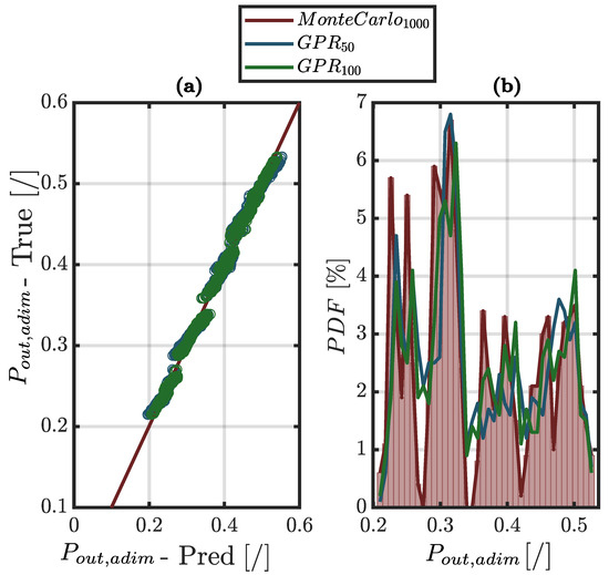 The outcomes show a clear overlap among the three surfaces. This means that the GPR potential is saturated; that is, increasing the number of observations resulted in a very similar surface. On the other hand, the accuracy of the metamodel can be considered good enough for statistical purposes. When looking at Figure 7, it is possible to reach the same conclusion. The distributions on the right (Figure 7b) differ for some localized values, but the general statistical behavior is similar among the two surrogates’ PDF and the expensive models. Moreover, this is consistent with the left image (Figure 7a) of the same Figure 7: the majority of data points align closely with the bisector of the plane defined by the real model’s normalized power output (—True on the y-axis) and the normalized power values predicted via surrogate models (—Pred on the x-axis). In the case of a perfectly accurate model, all data points would lie precisely on the bisector. Furthermore, there is evident minimal dispersion among the data points. The most significant deviations from the bisector (which describes the ideal prediction) are confined to a specific, limited region within the domain populated by only a few data points (<1%). The lack of samples made it difficult for the surrogate model to predict the output variable in those areas. When looking at Figure 7b, it can be seen that the green () and blue () curves do not follow the course of the red curve () with the same accuracy as with the other intervals.