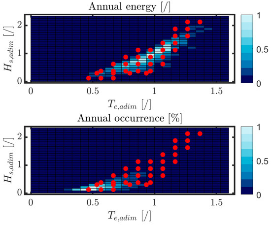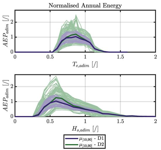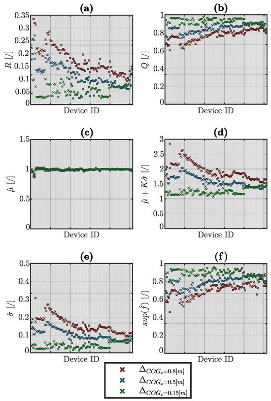A classic Monte Carlo process was adopted with the aim of propagating uncertainties and avoiding assumptions inherent in the procedure. Two variables were defined as being subject to uncertainty. The first parameter was the device’s pitch inertia . Previous analyses [45] highlight its impact on device performance. To propagate uncertainty concerning this variable, it was necessary to define a probability distribution for the associated uncertainties. A uniform distribution within the probability box defined by the interval [, ] was chosen for the uncertainty of , where is the nominal expected value for the parameter. The choice was made after considering the effects on the pitch inertia of the device due to variations in the distribution of masses of the stern and bow ballasts. Consistent with the considerations for the first parameter described above, the second parameter subjected to real-world uncertainties was the position along the z-axis of the device’s center of gravity . For this parameter, the uncertainty was modeled as an additive variation from the nominal value : [,], describing again a uniform distributed probability-box. Different values of additive noise were set, and their relative impact in the robustness quantification was observed. The output of the robustness analyses was the normalized power () generated through the device via harvesting wave energy, denoted as , normalized with respect to the maximum generated power in the whole dataset of the analyzed device :