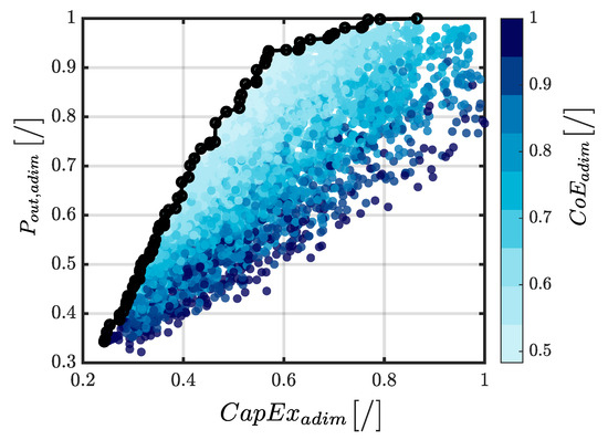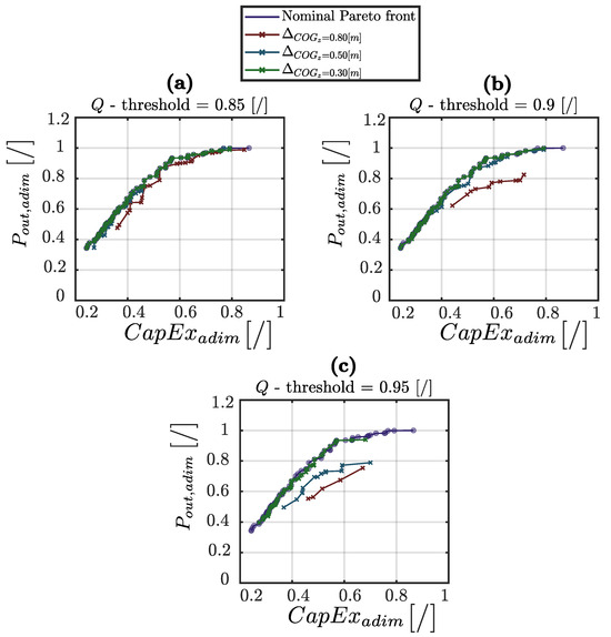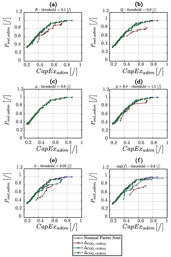 Motivated by the necessity of WEC systems’ RO, the present study evaluates different robustness indices (RIs) for WEC design solutions and assesses their impact on devices’ overall normalized power performance (Equation (18); i.e., it performs a stochastic Robustness Quantification (RQ) investigation for WEC systems. To achieve this objective, the present study conducted an analysis to gather information regarding the robustness of these devices generated in terms of a dataset processed during a multi-objective nominal optimization process. First, nominal Pareto set devices RI were evaluated, and information about their statistical behavior was obtained accordingly. This nominal classification is discussed in accordance with the standard Pareto criterion. Threshold criteria were then imposed on robustness indices and new Pareto research, highlighting the main differences between obtained and nominal limit sets. Furthermore, due to the computational burden associated with the uncertainty propagation, performed via a Monte Carlo simulation, a surrogate-assisted RQ method is proposed. The reason for presenting the results and devices’ data for the case study examined in normalized form is the confidential and industrial nature of the analyzed technology. Despite this limitation, the results presented in this non-dimensional form are sufficient to draw conclusions regarding robustness and, thus, adequate for the purpose of this study.