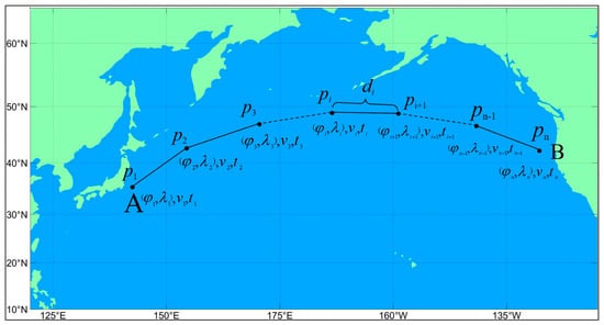 In the route-optimized design, the whole route is defined as a combination of multiple route points, that is, the route is divided into multiple route segments, each including latitude and longitude coordinates and navigation speed v. The starting position and the end position as well as the departure time and arrival time are set. Route optimization is used to find the shortest and safest route. The route consists of n waypoints, which are represented as , and the corresponding speed is represented by , as shown in Figure 2.
