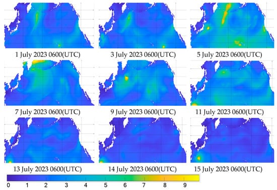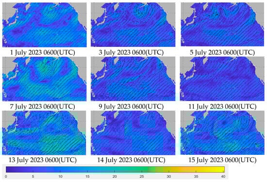 Historical weather data from of the Pacific Ocean were selected as the input of the simulated environmental data. In order to make the experimental ship sail closer to the actual navigation environment, the environment data were updated every 1 h and re-entered into the model. Figure 3 and Figure 4 show part of the data visualization.