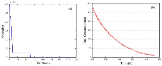 In this experiment, in order to verify the feasibility of the proposed route optimization model in bad weather, this experiment adopts three methods for route planning and compares them under the same navigation conditions. The Great Circle Route is the shortest route between two points on the sphere, that is, in the ideal environment, the ship will take the Great Circle Route as the best choice; in reality, however, the ship is not easy to sail along the Great Circle Route, and considering the dangerous meteorological environment, the route will be adjusted. Therefore, three kinds of route planning are adopted to find the optimal route, including the Great Circle Route, the GA Optimization Method, and the NSGA-II Optimization Route, which are the classic ship routes. Figure 6a,b show the convergence rate of the genetic algorithm and Pareto solution set of the NSGA-II, respectively. Figure 6a uses a single-objective genetic algorithm with weights.
