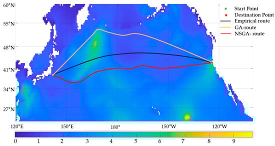 In the simulation experiment, the speed of the experimental ship is 15 knots, which is the speed of the circular route, that is, the speed of the empirical route. The speed of the other two optimized routes is calculated according to the speed loss calculation formula. Table 5 shows the parameter settings of the two methods. In the case of the same ship navigation environment, the routes obtained by the two optimization methods are compared with the classic routes. Table 6 shows the route information obtained by different methods. Figure 7 shows the optimal path optimized by the two algorithms.