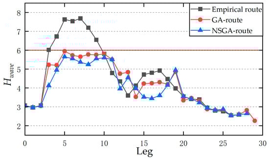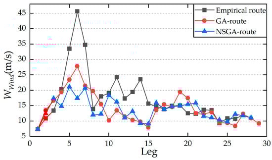 Figure 8 shows the significant wave heights experienced by the three routes at different time and space positions; the red solid line represents the maximum allowable significant wave height (H = 6 m). From Figure 8, it can be found that during the period of segment 4–10, the wave height of the empirical route exceeds the allowable wave height limit, even exceeding 7 m. Therefore, there is a great risk in following the empirical route; in contrast, the other two optimized routes can avoid the high wind and wave area and rationally allocate the speed. Figure 9 shows the wind speed of the three routes at different time and space positions. It can be seen that the wind field of the two optimized routes is stable and safe compared with the Great Circle Route. Compared to the GA route, the NSGA route has the characteristics of short time consumption and low energy consumption.