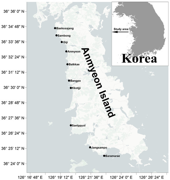 - Kahng, T. The Coastal Landforms and Landscapes on the West Side of Anmyeon Island in the South Chungcheong Province. Geomorphol. Assoc. Korea 2004, 11, 75–84. [Google Scholar]