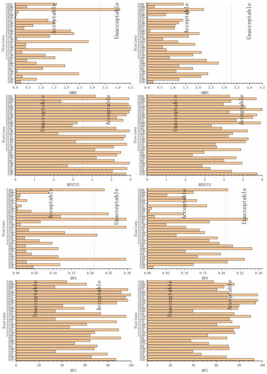 - Wu, H.-Y.; Fu, S.-F.; Hu, W.-J.; Chen, F.-G.; Cai, X.-Q.; Chen, Q.-H.; Wu, Y.-B. Response of Different Benthic Biotic Indices to Eutrophication and Sediment Heavy Metal Pollution, in Fujian Coastal Water, East China Sea. Chemosphere 2022, 307, 135653. [Google Scholar] [CrossRef] [PubMed]
