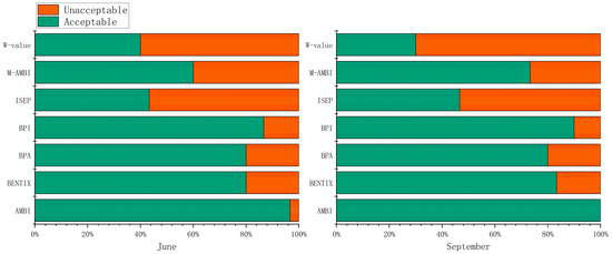 | Shannon–Wiener Evenness Proportion (ISEP) | Acceptable ≥ 0.359; Unacceptable < 0.359 | [42] | |