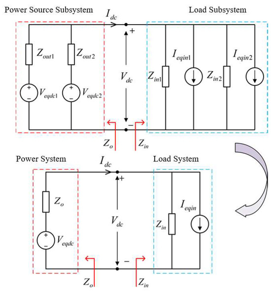By connecting the virtual impedances on the DC bus side of the bidirectional DC/DC converter in the lithium battery energy storage unit in parallel, the output impedance of the lithium battery energy storage unit is reshaped, thereby impacting the equivalent output impedance on the power source side. An equivalent impedance model of the DC microgrid after impedance reshaping is shown in Figure 5. The green and blue dotted boxes represent the power source subsystem and the load subsystem, respectively.