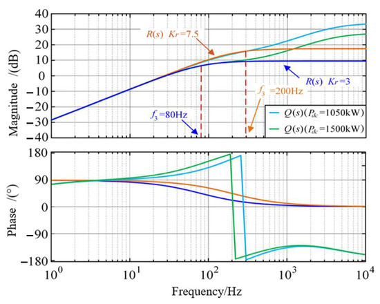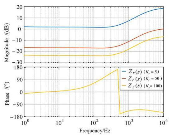 In order to approximate the virtual impedance expression as a fixed value in the range of 1–200 Hz for impedance reshaping, the cutoff frequency () of is set to the value when the DC bus power () is equal to 1050 kW. corresponds to a cutoff frequency of 200 Hz. At this point, adjusting the gain coefficient allows us to obtain virtual impedances with different amplitudes, as shown in Figure 8.