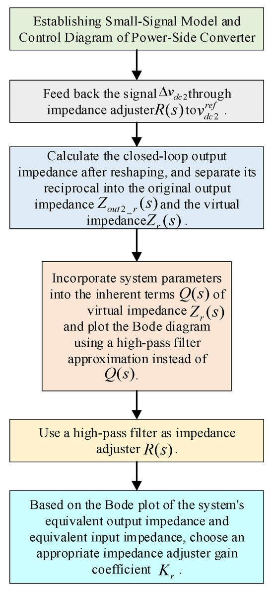 However, when the power converter is not under closed-loop control, the traditional series and parallel virtual impedance schemes fail to address this issue. Therefore, scholars at home and abroad have conducted in-depth research on methods to control the bus voltage stability of DC microgrids using impedance reshaping. The authors of reference [21] established a detailed impedance model, considering the influences of grid impedance and control delay, analyzed the main factors leading to enhanced negative damping effects and high-frequency resonance in voltage source converters (VSCs), and proposed a coordinated reshaping approach using this analysis, effectively suppressing the high-frequency resonance caused by high-frequency negative damping. The authors of reference [22] proposed an impedance reshaping control method that extracts the dynamic components of grid voltage, compensates for the power output accordingly, coordinates power output regulation, and neutralizes voltage dynamics in the power flow direction, thereby stabilizing the bidirectional power flow and grid-side voltage. Experimental verification has demonstrated the correctness and feasibility of this method.