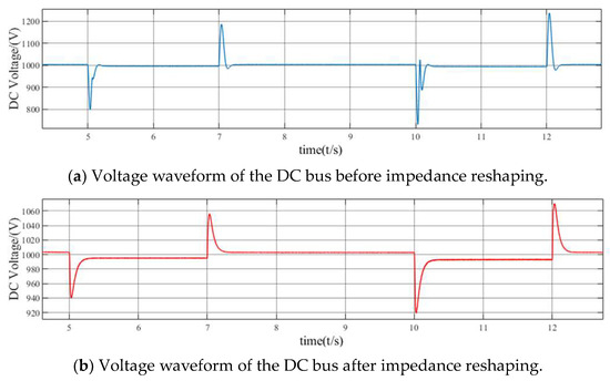 To verify the anti-interference ability of the DC bus voltage before and after impedance reshaping, comparative experiments are conducted, with the impedance regulator coefficient set to 0 and 100, respectively. The voltage waveform under sudden load additions and removals at different power levels of the DC bus is shown in Figure 14. By comparing Figure 14a,b, it can be seen that, with the intervention of the impedance regulator, instantaneous voltage changes during load additions and removals are significantly reduced. Additionally, during the recovery process of the DC bus voltage, the original voltage oscillations are eliminated. This indicates that the introduction of the impedance regulator effectively stabilizes the DC bus voltage and further improves its anti-interference capability.
