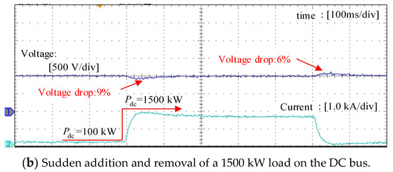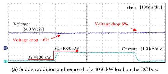 In Figure 17, the experimental results of sudden load addition and removal on the DC bus of a hybrid propulsion tugboat with an impedance adjuster = 100 are presented. From Figure 17a, it can be observed that after the introduction of the impedance adjuster, the DC bus power surges from 100 kW to 1050 kW, causing a 6% drop in the DC bus voltage, which then increases to 1000 V through adjustment. During sudden load removal, the DC bus voltage rises by 6%, stabilizing at 1000 V after a brief adjustment.