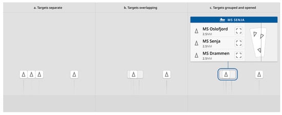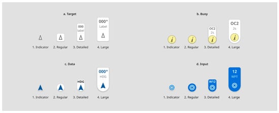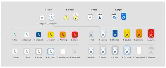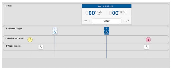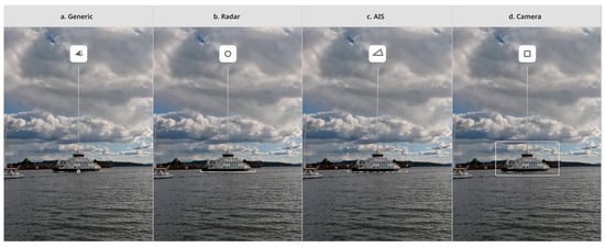 21]. All moving target POIs have an icon that describes the POI according to the sensor detecting it, such as RADAR, AIS, or camera identification. The navigation target POIs use icons representing the type of navigation target. Examples of IEC icons used for identifying different types of targets are shown in