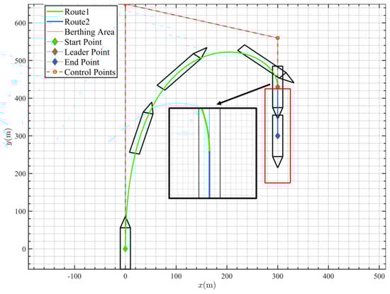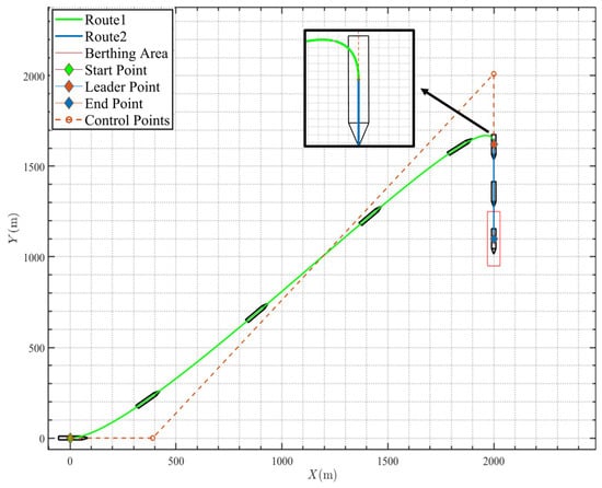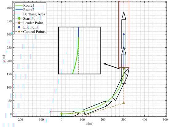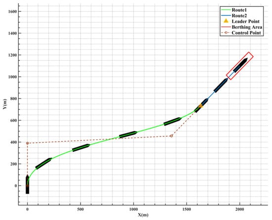 This paper divides the entire berthing process into two stages: the in-bound stage and the in-moor stage. These two stages are continuous in time and are demarcated by a pre-set leader point, typically determined based on experience and connected, respectively, by a third-order Bezier curve and a first-order Bezier curve. The main task of the in-bound stage is to guide the vessel from the entrance of the port to the leader point near the berth. The in-moor stage involves guiding the vessel from the leader point to the berth and safely mooring it. The key tasks in this stage include controlling the vessel’s speed and orientation to align the vessel’s body parallel to the port and gradually reduce speed within the permissible berthing range. As shown in Figure 2, the diagram depicts a dual-stage Bezier berthing trajectory, with the green line (Route1) representing the in-bound stage and the blue line (Route2) representing the in-moor stage, separated by a yellow triangular leader point. The brown circle denotes the control points of the third-order Bezier curve (Route1). As Route2 is a first-order Bezier curve, its control points, representing the starting and ending points, are not illustrated in this diagram. Ultimately, the vessel successfully enters the berthing area indicated by the red rectangle.