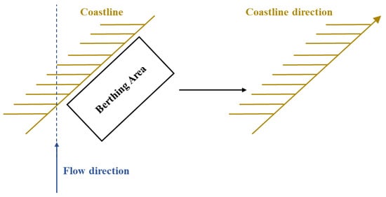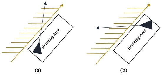 Based on the relationship between the ship’s heading and the direction of water flow, this study determines the criteria for berthing scenarios downstream and upstream. The judgment process comprises two main steps: firstly, determining the shoreline direction based on the direction of water flow. As illustrated in Figure 3, the left blue line represents the direction of water flow, the inclined yellow line represents the shoreline, the horizontal yellow line represents the land area, and the black rectangle indicates the designated berthing area. Initially, the shoreline is assumed to be a directionless straight line. Then, this line is intersected with the direction of water flow, with the direction forming acute angles with the water flow being designated as the shoreline direction. Subsequently, the berthing direction is determined based on the shoreline direction and the berthing mode. As depicted in Figure 4a, if the berthing mode is downstream, the vessel’s heading upon completion of berthing should form an angle of less than 90° with the shoreline direction, as described by the angle relationship in Equation (3),