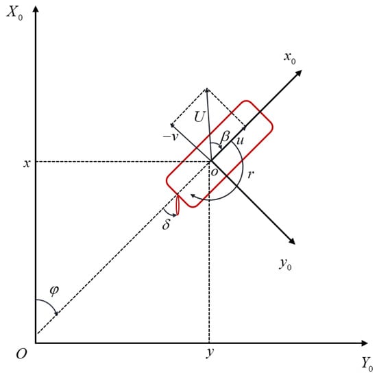 Given that the center of gravity of a USV is located in the lower part of the vessel and horizontal motion is predominant in most cases, the influences of heave, pitch, and roll motions are negligible and can be disregarded in this paper. Therefore, the motion model of the USV in this paper is simplified into a three-degree-of-freedom (3-DOF) model covering sway, surge, and yaw []. The motion parameters for each DOF are listed in Table 1. Two coordinate systems are used to describe the motion of the USV (Figure 5): the space-fixed coordinate system and the body-fixed coordinate system . Additionally, the red rectangle in Figure 5 represents the USV. In these coordinate systems , , and represent the position and yaw angle of the USV; , , and denote the components of motion velocity and yaw velocity; and represents the resultant velocity of the vessel. Additionally, , , and represent the external forces and moments acting on the hull; is the rudder angle; is the drift angle.