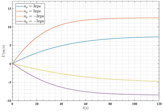 Based on the response of the vessel’s speed to different propeller inputs shown in Figure 6 in the preceding section, it is evident that as the propeller rotation speed increases within a certain range, the vessel’s acceleration/deceleration response becomes faster, eventually stabilizing the speed at a fixed value. With the berthing route determined, to expedite the berthing process, the propeller control input should be maintained at a relatively high value. Therefore, in this study, when the vessel needs to accelerate, the propeller is set to a fixed higher forward rotation speed; whereas when the vessel needs to decrease its speed, the propeller is set to a fixed higher reverse rotation speed.