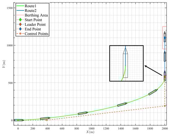 The advantage of using dual-stage Bezier curves lies in their ability to easily adjust the vessel’s approach during berthing. Considering the influence of water flow, vessels may need to switch between berthing downstream and upstream. Dual-stage Bezier curves allow for flexible adjustment of control point positions based on different water flow conditions and vessel operational requirements, thereby altering the shape of the berthing curve to accommodate specific berthing needs. This enhances the adaptability and flexibility of berthing operations. Additionally, the smoothness of these curves helps maintain the stability and safety of the vessel’s trajectory, ensuring that there are no abrupt changes or discontinuities during turning and positional adjustments, thus improving the accuracy and reliability of berthing operations.