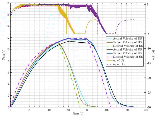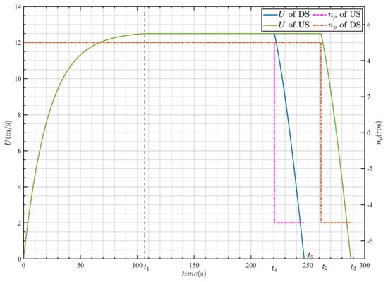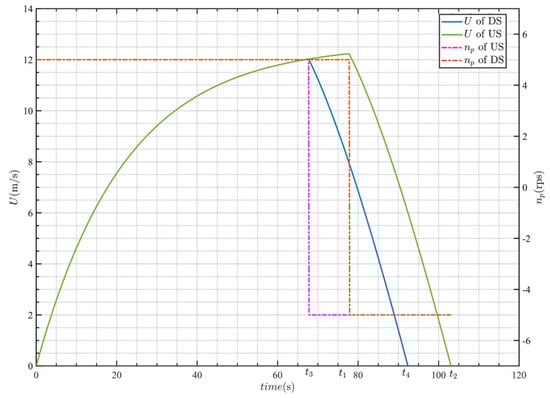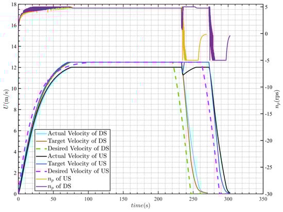The relationship between the ACD strategy and the AD strategy at various stages is illustrated in Figure 8. The blue curve represents the variation of vessel speed under the ACD strategy control, where denotes the acceleration stage, represents the constant velocity stage, and indicates the deceleration stage. The dashed pink line represents the propeller control input under the ACD strategy, maintaining during and transitioning to during . The red curve illustrates the vessel speed variation under the AD strategy control, with denoting the acceleration stage and representing the deceleration stage. Similarly, the propeller maintains during and transitions to during .
