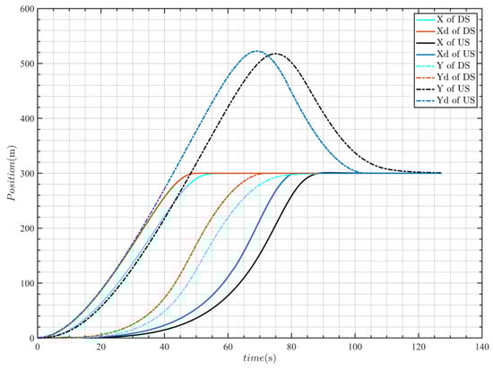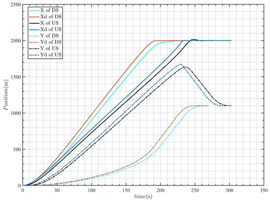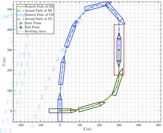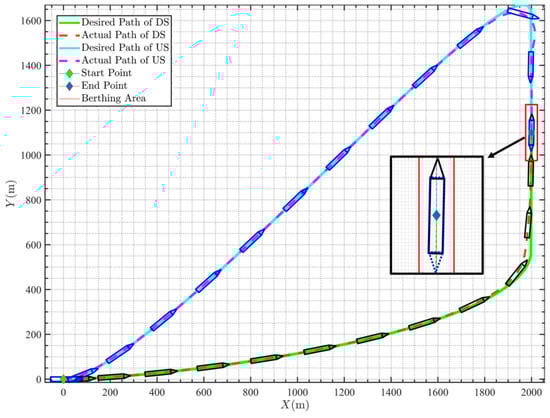 After obtaining the berthing path and matching velocity, the dual-loop path control system is utilized to track the desired path. The control system parameters are shown in Table 4. The path-tracking performance is shown in Figure 13. The solid green and cyan lines, respectively, represent the desired paths for downstream and upstream berthing, while the dashed red and pink lines depict the actual berthing curve obtained from the simulation. Comparing the two curves, it can be observed that the dual-loop path tracking control system effectively tracked the target path and successfully completed the berthing task. To clearly observe the vessel’s attitude at the end of berthing, the endpoint position is magnified, as shown in Figure 13. From the magnified section, it can be observed that at the termination of the berthing task, the ship’s hull is nearly parallel to the berth, with the ship’s center positioned near the endpoint. For a clearer observation of the tracking effectiveness of the dual-loop tracking control system, Figure 14 displays the temporal tracking graph of the position, it can be observed from the graph that despite some temporal delay in position tracking, at the conclusion of the berthing task, the vessel’s position closely aligns with the desired position .
