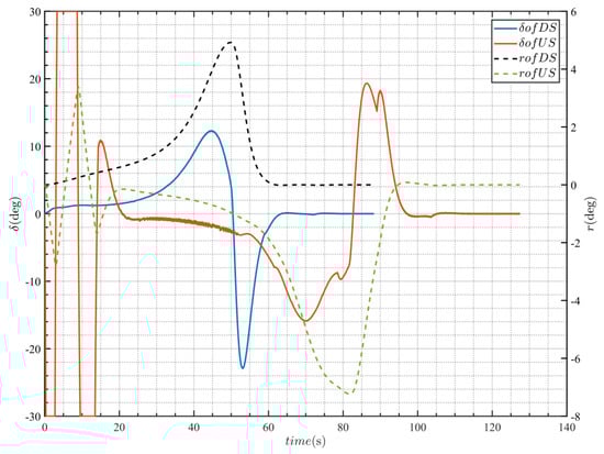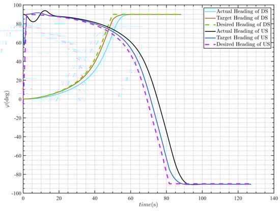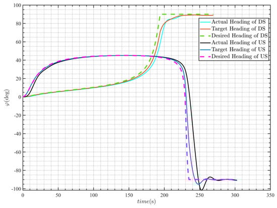 The tracking performance of the vessel’s velocity is illustrated in Figure 15. The green and pink dashed lines, respectively, represent the desired velocity output by the BPVM method for downstream and upstream berthing. The red and blue solid lines represent the target velocity output by the position tracking subsystem. The cyan and black solid lines represent the actual vessel’s velocity curves. The yellow and purple solid lines represent the propeller rotation speed during the downstream and upstream berthing processes, respectively. From the graph, it can be observed that despite some oscillation in propeller rotation speed during the acceleration and deceleration phases, the velocity variation curve remains smooth. However, during the constant velocity phase, there exists a certain static deviation between the actual velocity and desired velocity . This is attributed to the absence of an integral component in the design of the velocity controller, preventing error accumulation and resulting in a static speed deviation. Nonetheless, this is intentional within this study, as maintaining the desired position (Xd, Yd) ahead of the vessel’s position throughout the berthing task is advantageous for the stability of the control system. Similarly, the comparison between the desired heading , target heading , and actual heading is illustrated in Figure 16. The temporal variation curves of rudder angle and yaw velocity for downstream and upstream berthing are shown in Figure 17. From Figure 16 and Figure 17, it can be inferred that upon completing the final berthing task, the vessel’s heading aligns closely with the berth, with the rudder angle and yaw velocity essentially at 0. This indicates that immediately after the conclusion of the berthing task, the vessel’s heading remains relatively stable without significant changes.