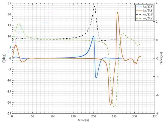 Time-domain graph of rudder angle and yaw velocity variation for short-distance berthing.