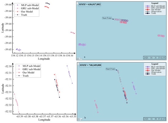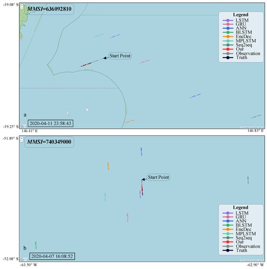 Comparison of the predicted trajectories of the AMD model with the sub-extraction model. (a) Vessel trajectories ( = 636,017,002) in the Australian dataset. (b) Vessel trajectories ( = 740,349,000) in the Argentina dataset.