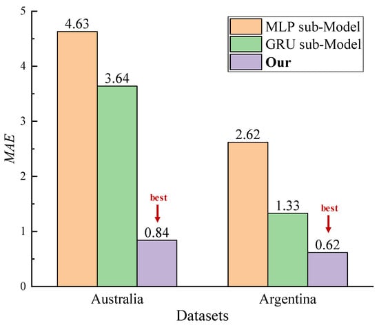 As mentioned earlier, the AMD model was based on MLP and GRU networks. To verify the efficacy of the AMD model, we compared it to those from the sub-extraction models constructed from MLP and GRU. AIS and environmental datasets were directly associated with training the sub-model. That is, the input dimension and input step were 10 and 2, respectively.