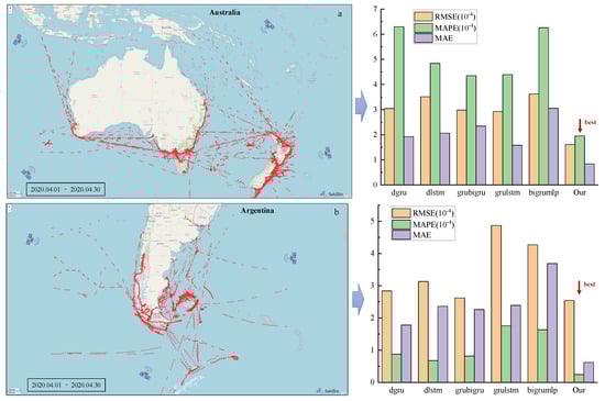 Our experimental results were based on the Australian and Argentina datasets. Table 5 shows that the AMD model was the most effective on various evaluation indicators. Specifically, in terms of and metrics, the results of various models in the Australian dataset showed that our model exhibited improvements of at least 55.4% and 57.09%, respectively. These results proved that using AMD modal information with various neural networks to adapt to multimodal AIS and environmental data has obvious advantages in improving vessel trajectory prediction capabilities.