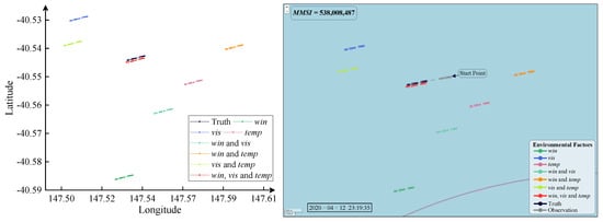 This study explicitly considered three environmental factors: wind (including wind speed and direction), visibility, and air temperature. This section details the series of experiments that were set up to verify whether considering sufficient environmental factors is necessary to improve the AMD model’s reliability. Specifically, six comparison experiment groups were created using the control variable method. The AIS data input dimension information remained unchanged and the environmental data factor input type changed. That is, the environmental dataset contains only win factors; only factors; only factors; and factors; and factors; and and factors. The AMD method we designed was trained on these six comparison datasets to obtain a model; then, the prediction results were obtained when the model was applied to the test dataset.