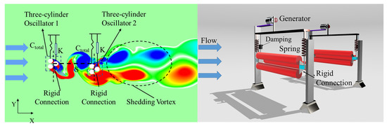 In order to maximize the power density of the VIV hydrodynamic converter for energy capture, it is essential to consider a multi-cylinder arrangement. Conducting research on fluid-induced vibration (FIV) of a multi-cylinder system consisting of more than two cylinders holds great significance in the field of engineering design and its practical applications. When a fluid flows through multiple cylinders, its hydrodynamic characteristics and FIV response are complex due to the interactions of the cylinders; this differs from a single-cylinder scenario. As a result, numerous scholars have conducted research on the eddy current interaction in multi-cylinder systems. Among them, the energy-harvesting structure composed of two cylinders was the representative structural form [30].