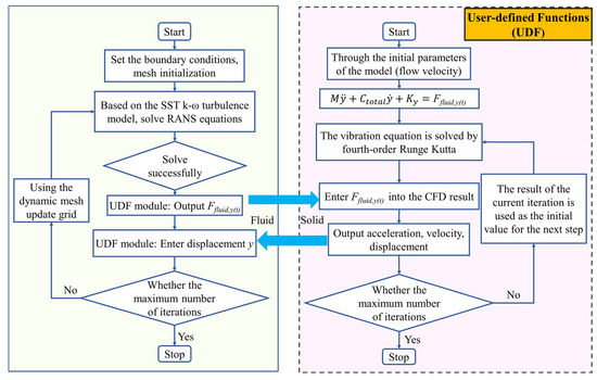 The structure vibration equations are discretely solved using the fourth-order Runge–Kutta method. At each time step, the solid vibration equations are solved based on the user-defined function (UDF). The results obtained from solving these equations are then transferred to the fluid equations to obtain a bidirectional fluid–solid coupling calculation, as shown in Figure 2. The fourth-order Runge–Kutta method was chosen due to its high computational efficiency and superior computational accuracy.