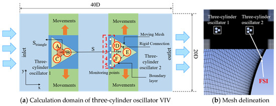 The calculation domain is characterized by four boundary conditions: inlet, outlet, sidewall, and fluid–solid interaction boundary (FSI). The fluid enters the boundary as a velocity inlet and exits as a pressure outlet, while the top and bottom of the calculation domain act as sidewalls. To further explore the impact of water flow passing through the upstream three-cylinder oscillator on the downstream counterpart, five equidistant velocity monitoring points are established at a distance of 0.25D from the downstream three-cylinder oscillator. These monitoring points enable the observation of water flow characteristics and their effect on the downstream three-cylinder oscillator.