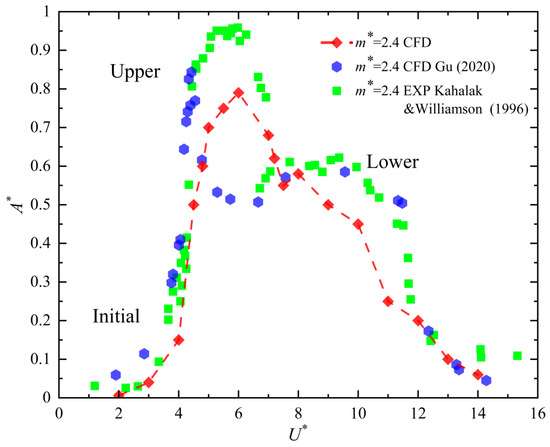 Comparison of amplitude ratio A* between the numerical results and experimental results [45,46].