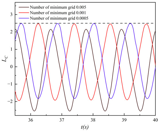 The validation results are presented in Table 4. The validation results indicate that when the minimum grid density is set to 0.001, the influence of the grid on the experimental results is almost negligible. This confirms that the grid density at this level is sufficient to meet the accuracy requirements for the calculation results. Consequently, the grid density of 0.001 was adopted for the subsequent calculations to obtain reliable and accurate simulation outcomes. Figure 5 shows the change in lift coefficient with time under three quantities of grid division. The purpose is to assess the effect of these time steps on the calculation accuracy, with the average lift coefficient used as an indicator.