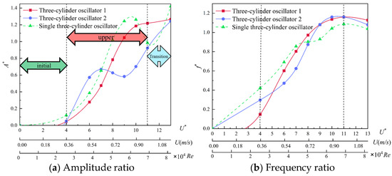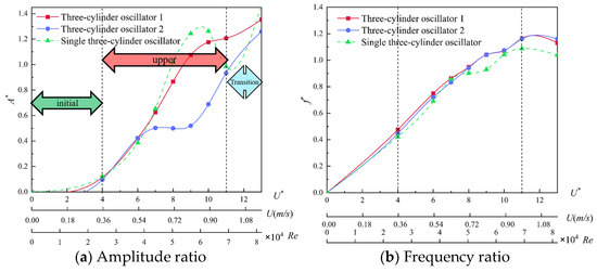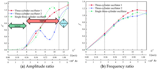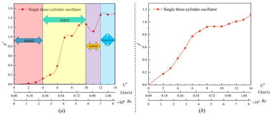 To demonstrate the impact of centralized capturing of hydrokinetic energy in the three rigidly connected cylinder oscillators, we analyzed the VIV response of a single three-cylinder oscillator within a range of reduced velocities, U* = 2~14, along with the corresponding flow velocity and Reynolds number. In Figure 6, it can be observed that when the vibration frequency fosc is close to the natural frequency fn,water within, the vibrating structure (f* = fosc/fn,water ≈ 1) enters a lock-in state with a relatively high amplitude. As the reduced velocity increases, the response of the rigidly connected three-cylinder oscillator exhibits distinct branches: an initial branch, an upper-end branch, and at U* = 10~12, a short lower-end branch, before transitioning into the branch where VIV transforms into galloping vibration.