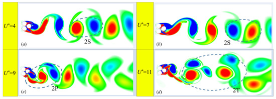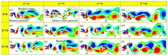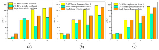 When Z = 8, increasing the reduced velocity results in an increase in the lift force experienced by the upstream oscillator. The difference between the lift values of the upstream and downstream oscillators is maximized at U* = 9. For U* = 4 and 7, the lift value of the downstream oscillator surpasses that of the upstream oscillator. Figure 8a,b illustrates how the shedding vortex from the upstream oscillator affects the downstream oscillator, lifting it through the wake vortex effect and creating a stronger motivating force. At U* = 11, both the upstream and downstream oscillators reach their maximum lift values. As shown in Figure 8, the wake vortex detached from the upstream oscillator only collides with the outer side of the downstream column group, weakening its impact on the downstream oscillator motion and producing a slight inhibitory effect. Additionally, due to the interactions between the two three-cylinder oscillators, the peak lift values of both oscillators in the transition response branch are lower than those experienced by a single three-cylinder oscillator. Specifically, when Z = 12, the lift of the upstream oscillator increases with the increase in U*. When Z = 16, the mutual interference between the two oscillators is weakened, and the lift gradually increases with increasing reduced velocity.