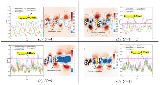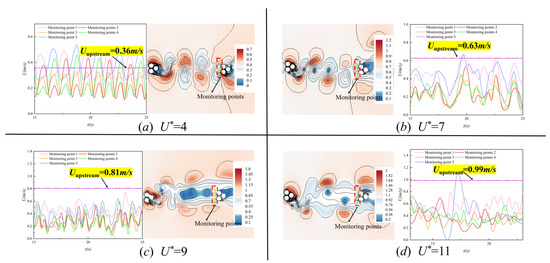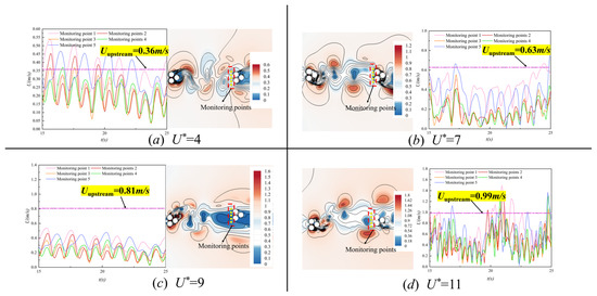 For Z = 16, the wake patterns of the upstream oscillator are stable and can evolve into a pair of stable vortices at a sufficient distance. There is a certain regularity in the velocity fluctuation, with the velocity of the downstream oscillator being higher than that of the previous two oscillators and closer to the inlet flow velocity. When U* = 4, the amplitude ratio of the upstream and downstream oscillators is nearly identical, as shown in Figure 11. Additionally, Figure 8i illustrates that the wake vortex can fully develop into a regular shedding vortex pair. At higher flow velocities, the fluctuation slows down, indicating a weakened interaction between the two three-cylinder oscillators. Notably, at U* = 9, the velocities at the downstream monitoring points are significantly smaller than the inlet velocities, as depicted in Figure 14. Observing Figure 8k and Figure 11a, it is evident that the vortex shedding from the upstream oscillator directly collides with the downstream oscillator, resulting in a decrease in the incoming flow velocity, which is much lower than the inlet flow velocity.