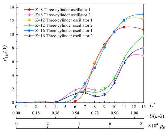 Figure 16 illustrates the harvesting energy magnitude (PVIV) of the oscillators at different inter-oscillator spacing ratios. In the lower branch, the flow velocity is significantly low, resulting in a low structural response frequency, small overall vibration amplitude, and minimal energy harvested for both the upstream and downstream oscillators. The harvesting energy curves for both oscillators are nearly identical across all spacing ratios. In the upper branch, the harvesting energy characteristics of the oscillators exhibit similar trends under different Z values. Based on previous research findings, it is evident that in the initial branch, U* < 4, the upstream oscillator exhibits a low vibration frequency, small vibration amplitude, and weak lifting force on the column group structure. Of the three spacing ratios, the downstream oscillator attains an energy harvesting efficiency of 8.4% only at Z = 8. Upon transitioning to the upper branch, particularly when 4 ≤ U* < 7, the excitation effect on the structure intensifies, leading to an increase in both the amplitude ratio and frequency ratio of the structure. When U* ≤ 7, the downstream oscillator is affected by the wake shedding from the upstream oscillator, resulting in the downstream oscillator harvesting higher energy compared to the upstream oscillator once the gap flow and wake patterns merge. This region is therefore identified as the dominant region for energy harvesting by the downstream oscillator. The response frequencies of the oscillators, when rigidly connected, approach their natural frequency in water when U* > 7. This weakens the interference effect between the upstream and downstream oscillators, causing the energy harvesting of the upstream oscillator to surpass that of the downstream oscillator. In this case, the dominant region for energy harvesting shifts to the upstream oscillator.