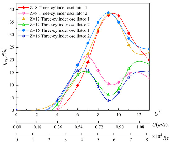 Harvesting the energy efficiency ηVIV of the two three-cylinder oscillators at different inter-oscillator spacing ratios, Z.