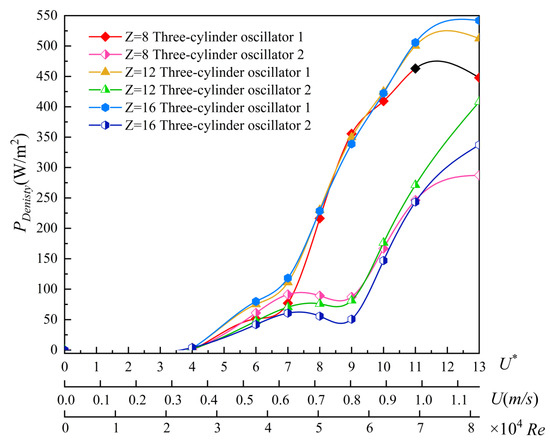 The energy-harvesting densities, PDenisty, of the two oscillators at different Z are given in Figure 18. Under the initial branch, the energy densities of the upstream and downstream oscillators at the various spacing ratios are almost indistinguishable, and the effect of the spacing ratio on the energy densities is not obvious. After entering the upper branch, the energy density increases with the increase in the reduced velocity, the energy densities of the downstream oscillator at U* = 6 are all larger than those of the upstream oscillator under the three spacing ratios, and the downstream oscillator harvests more energy after coupling with the upstream wake patterns. The upstream oscillator harvests more energy than the downstream at Z = 12 and 16 when U* = 7, but the downstream oscillator can harvest more energy when Z = 8. This shows that the space ratio Z affects the energy density of the upstream and downstream three-cylinder oscillator harvesting energy slightly.
