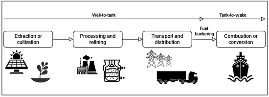 In the context of maritime transport, the well-to-wake (WtW) [36] approach assumes particular relevance. It focuses on the total emissions generated from the production and distribution of fuel—well to tank (WtT)—to its use in the ship’s engine—tank to wake (TtW) [37,38]. This distinction allows for a thorough examination of emissions at each stage, highlighting how optimization in any of the segments can significantly contribute to reducing the overall environmental impact of the maritime sector. The WtW approach thus facilitates the identification of effective strategies for reducing GHG emissions and pollutants, crucial for achieving sustainability goals in maritime transport. Figure 1 schematically illustrates the WtT and TtW approaches.