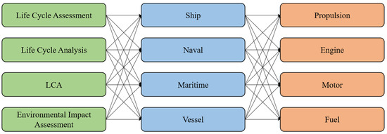 To determine the keywords, semantic fields, each containing four words, were chosen. The first family pertains to the environmental impact analysis (life-cycle assessment, life-cycle analysis, LCA, and environmental impact assessment), the second focuses on the naval sector (ship, naval, maritime, and vessel), and the last addresses the energy aspect (propulsion, engine, motor, and fuel). Figure 2 shows the adopted keywords. The selection of keyword categories was made in order to obtain documents as relevant as possible to the topic under investigation. Furthermore, the choice of individual keywords was influenced by the authors’ expertise and previous knowledge.
