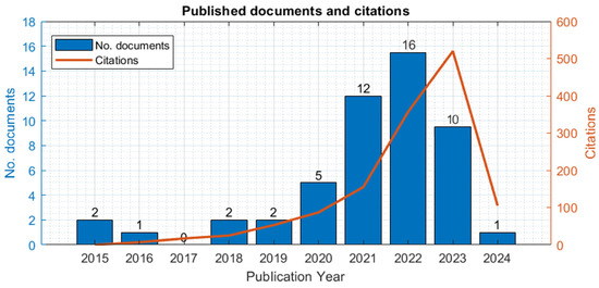 Among these documents, only peer-reviewed conference or scientific journal articles and book chapters in English were chosen. Following an examination of the title, abstract, and keywords, articles that seemed unrelated to the topic addressed in this review were excluded. As a result, 51 scientific articles remained, and these were subjected to a more in-depth analysis. These articles span a 10-year period from 2015 to 2024. Figure 3 illustrates both the number of publications and the corresponding citation counts for each year.